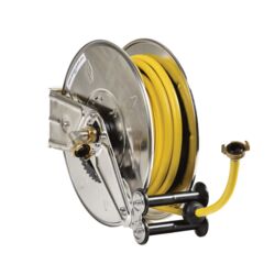 Boîtier en acier laqué - Rappel par ressort et blocage du tuyau Capacité du tuyau: 15 m - 1/2" (16 mm Ø ext.), 18 m - 3/8" (14 mm Ø ext.)