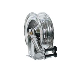 Boîtier en acier inoxydable - Rappel par ressort et blocage du tuyau Capacité du tuyau: 20 m - 1/2" (18 mm Ø ext.), 15 m 5/8" (21 mm Ø ext.)