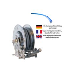Boîtier en acier laqué - Rappel par ressort et blocage du tuyau - Tuyau haute pression bleu, résistant à l'abrasion