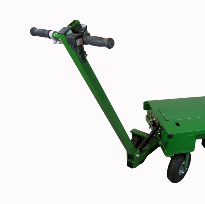 Grâce au timon, la brouette électrique peut être facilement utilisée lors de voyages en train. Le rayon de braquage est considérablement réduit grâce au timon rotatif.